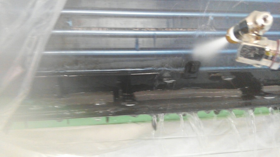 スタンダードコース・・・化粧カバーを取り外しアルミフィンを露出させて養生して高圧洗浄する。